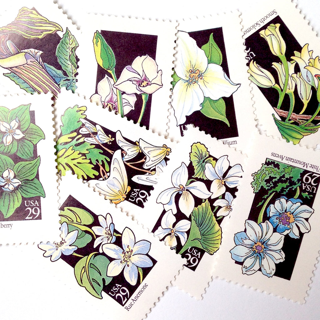 10 White Flower Forever Stamps Unused Green and White Botanical Postage Wild Flowers Forever Stamps For Mailing Wedding Invitations Cards
