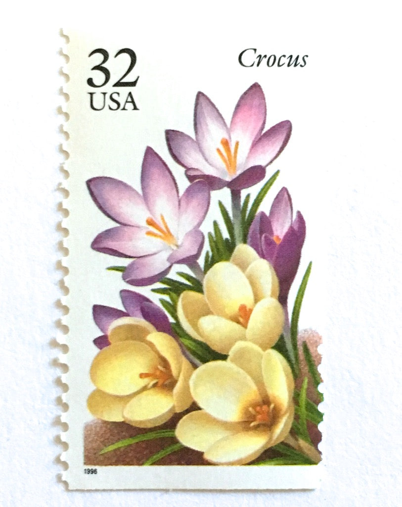 10 Vintage Botanical Flower Stamps // Unused Pink White Lavender Flower Postage // 32 Cent Floral Crocus Stamps for Mailing