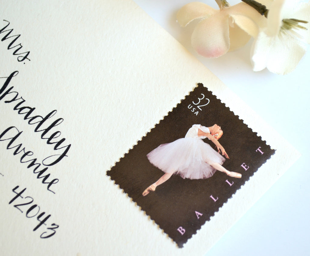 These vintage stamps are perfectly suitable for use as postage, as long as you use additional stamps to add up to the current postage rate. These beautiful ballet dancer stamps will add an enchanting personalized touch to your black and white wedding invitations, save the dates, or greeting cards.