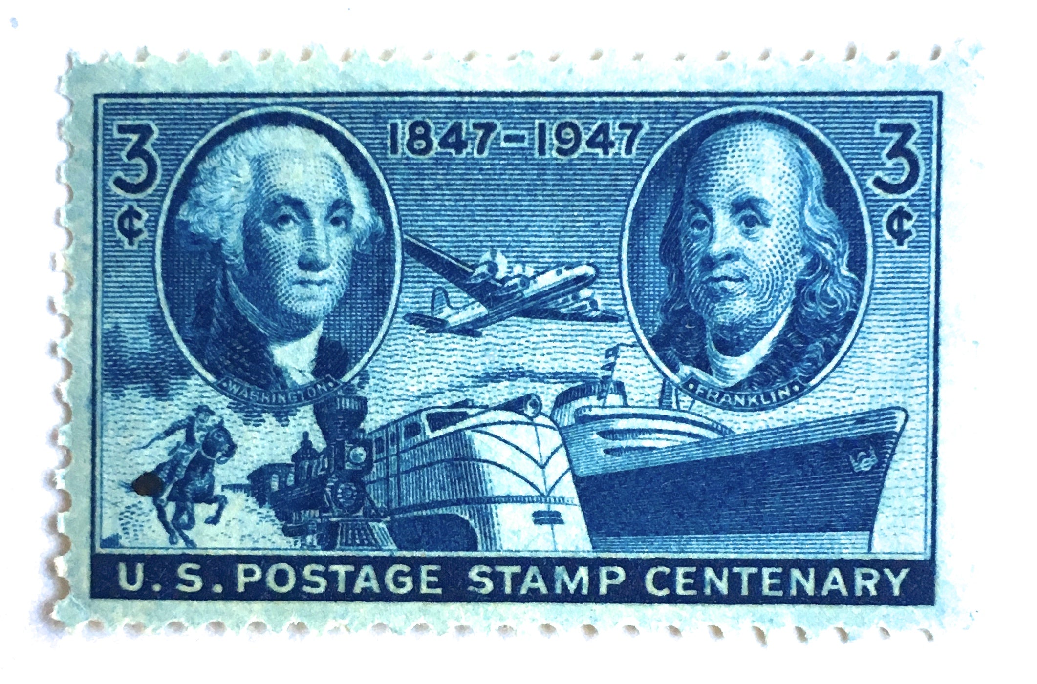 10 Blue Vintage Postage Stamps // 100th Anniversary of the Postage Stamp // 3 Cent Plane Train & Boat Stamps for Mailing