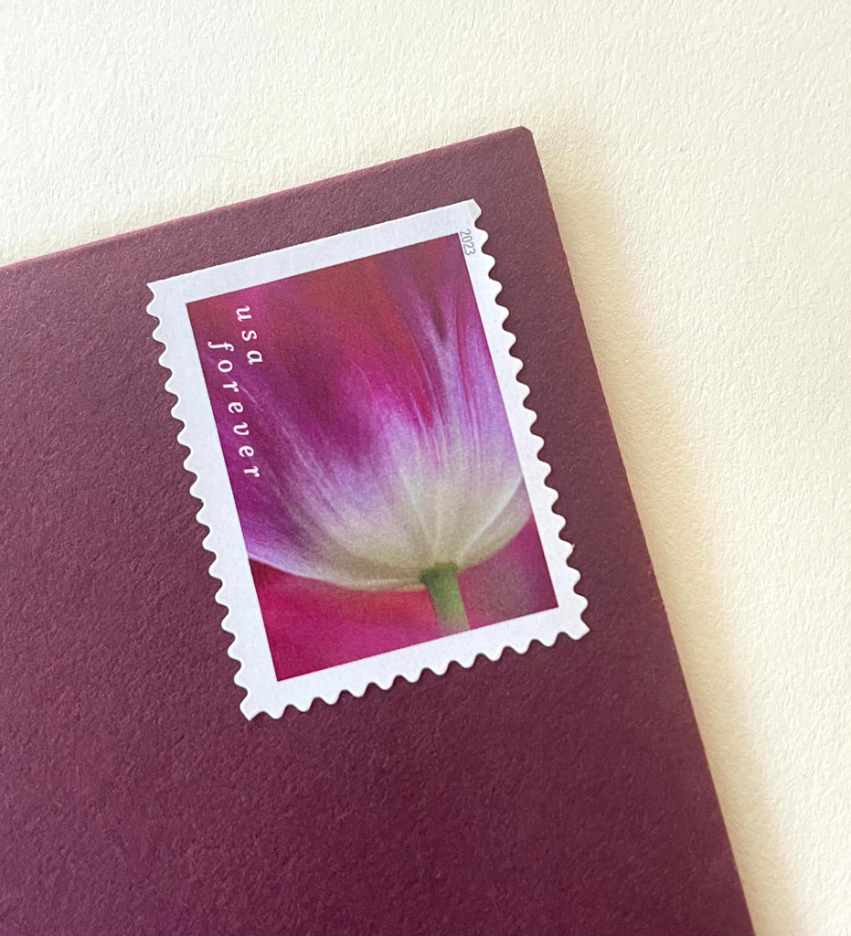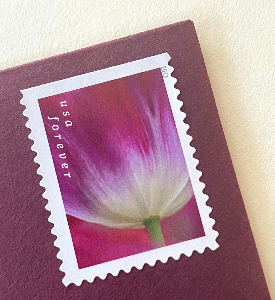 These USPS stamps are perfectly suitable for use as postage at the current Forever 1st class postage rate. These beautiful purple magenta tulip stamps will add an enchanting personalized touch to your garden wedding invitations, save the dates, or cards.