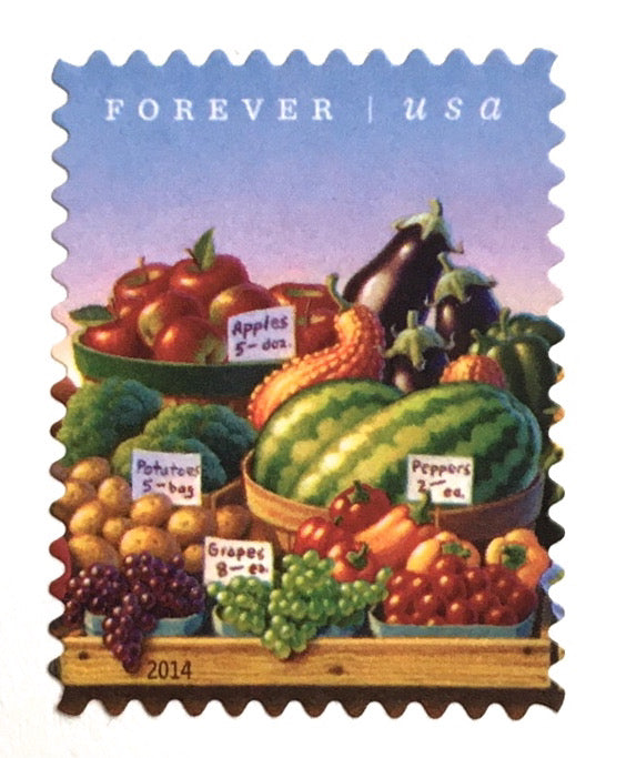 These farmer's market FOREVER stamps are perfectly suitable for use as postage for mailing at the current postage rate. These delicious stamps will add a festive colorful touch to your correspondence and Turkey Day cards and fall garden farm wedding invitations, or as a meaningful gift to the chef or food in your life.