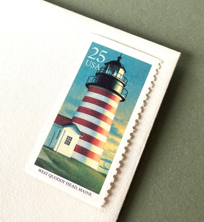 These stamps are perfectly suitable for use as postage for mailing, as long as you use additional stamps to add up to the current postage rate. These beautiful West Quoddy Lighthouse stamps will add an enchanting touch to your nautical cards, or destination beach wedding invitations or Maine save the dates.