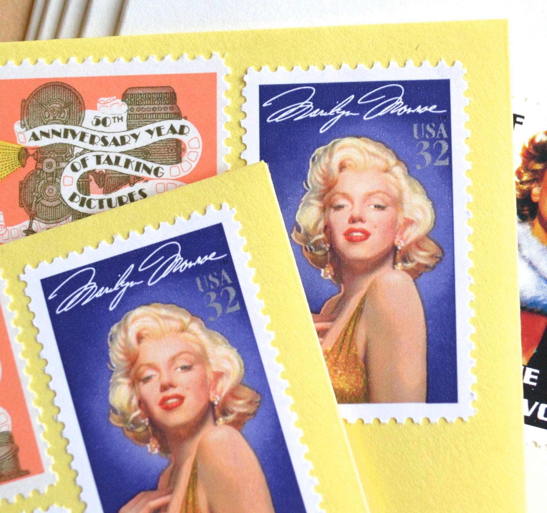 These classic stamps are perfectly suitable for use as postage for mailing, as long as you use additional stamps to add up to the current postage rate. These classic film star stamps will add an enchanting touch to your wedding invitations or cards.