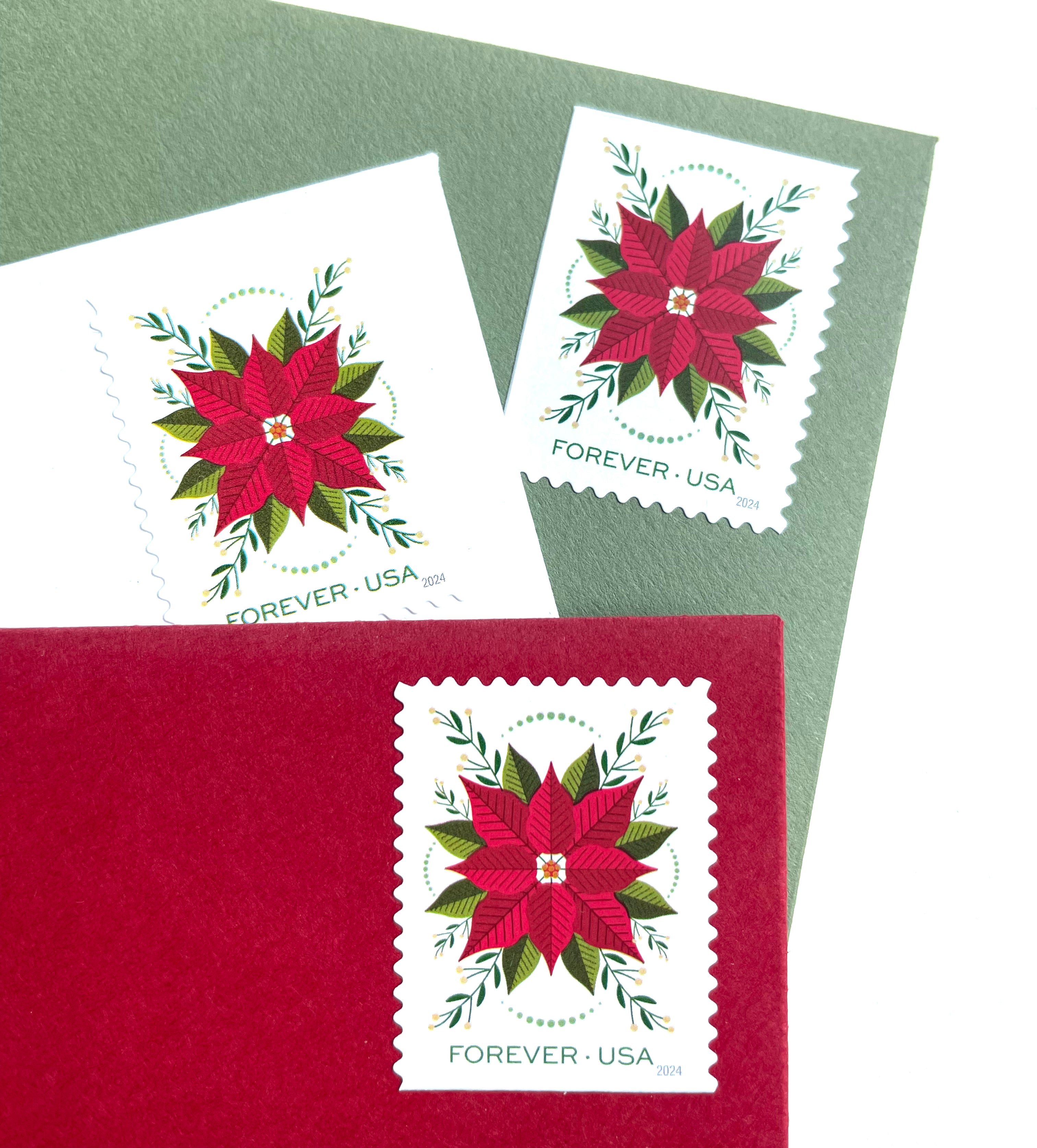 These Poinsettia holiday stamps are perfectly suitable for use as postage for mailing at the current rate. These beautiful red and green stamps will add a charming touch to your Christmas cards, holiday mail or winter wedding invitations or greeting cards.