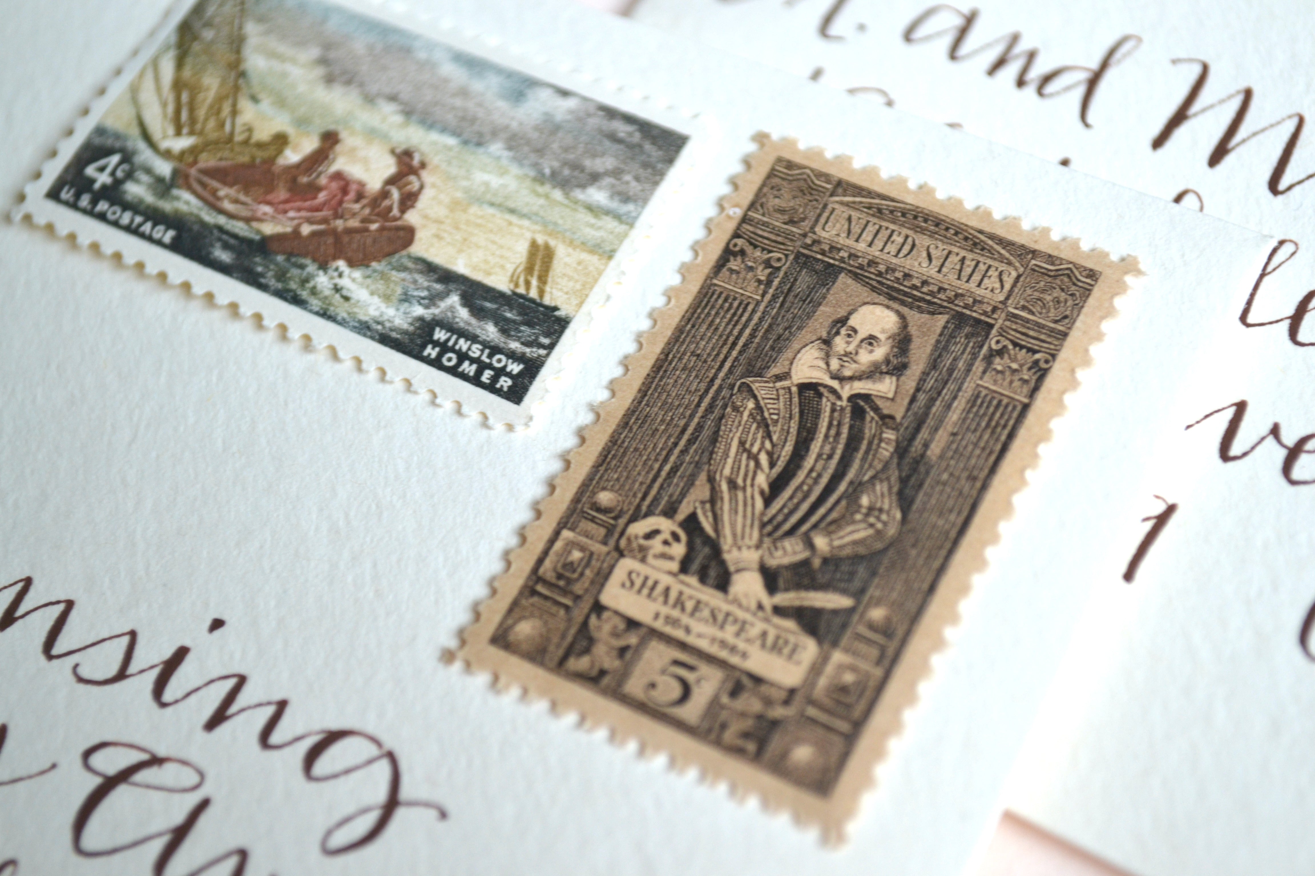 Includes a total of 10 (TEN) 5¢ vintage Shakespeare stamps.