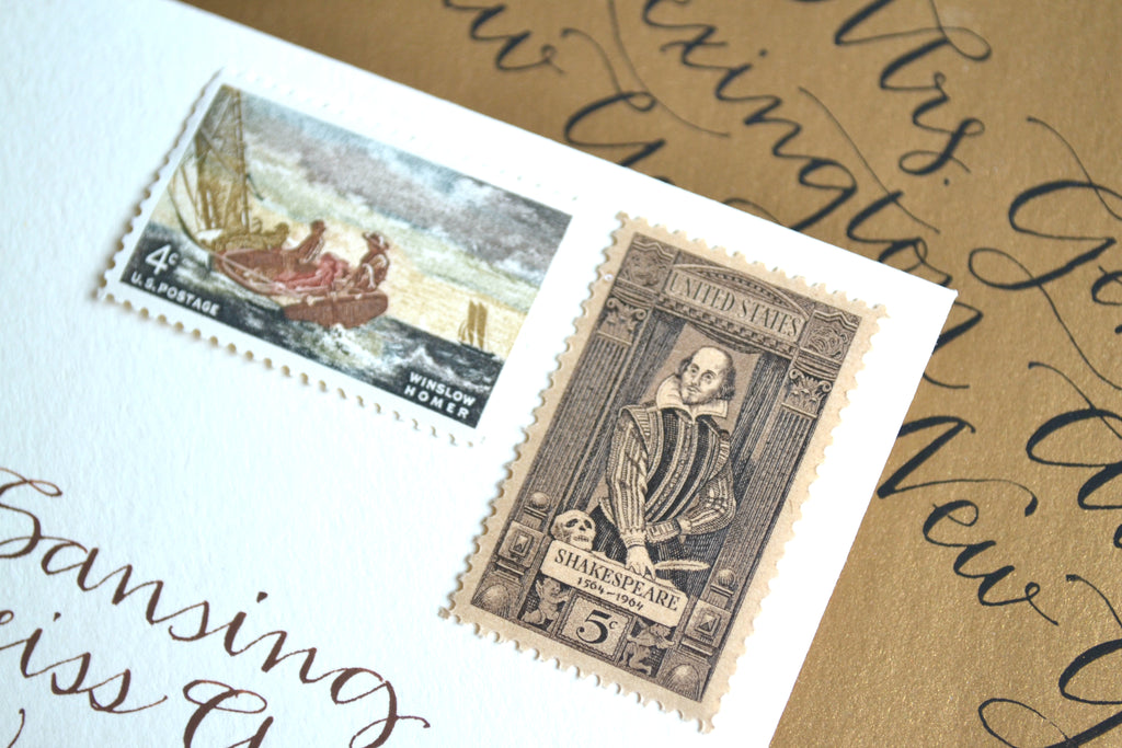 These golden stamps are perfectly suitable for use as postage for mailing, as long as you use additional stamps to add up to the current postage rate. These beautiful vintage stamps will add an enchanting touch to your classical or 1920s wedding invitations or cards.