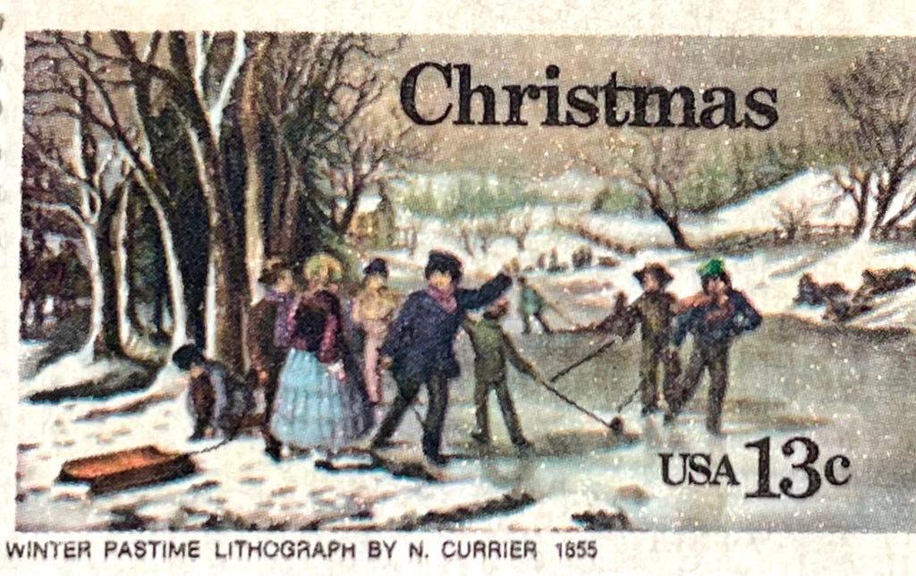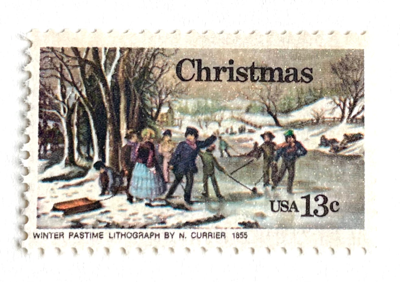 10 Vintage Christmas Postage Stamps // Winter Pastime // Ice Skating // Sledding // Lithograph Currier and Ives Unused Stamps for Mailing