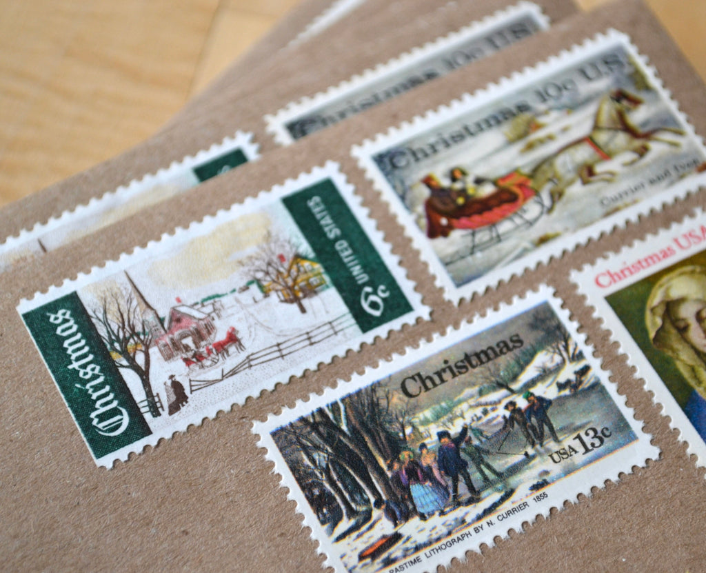10 Vintage Christmas Postage Stamps Currier and Ives Unused Stamps for Mailing