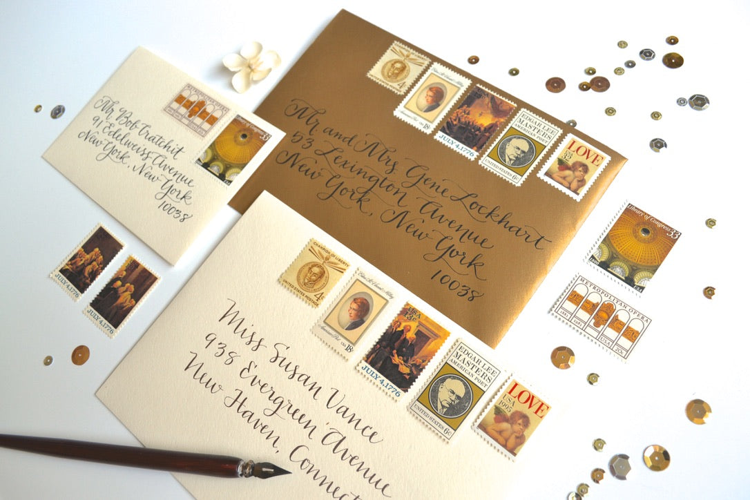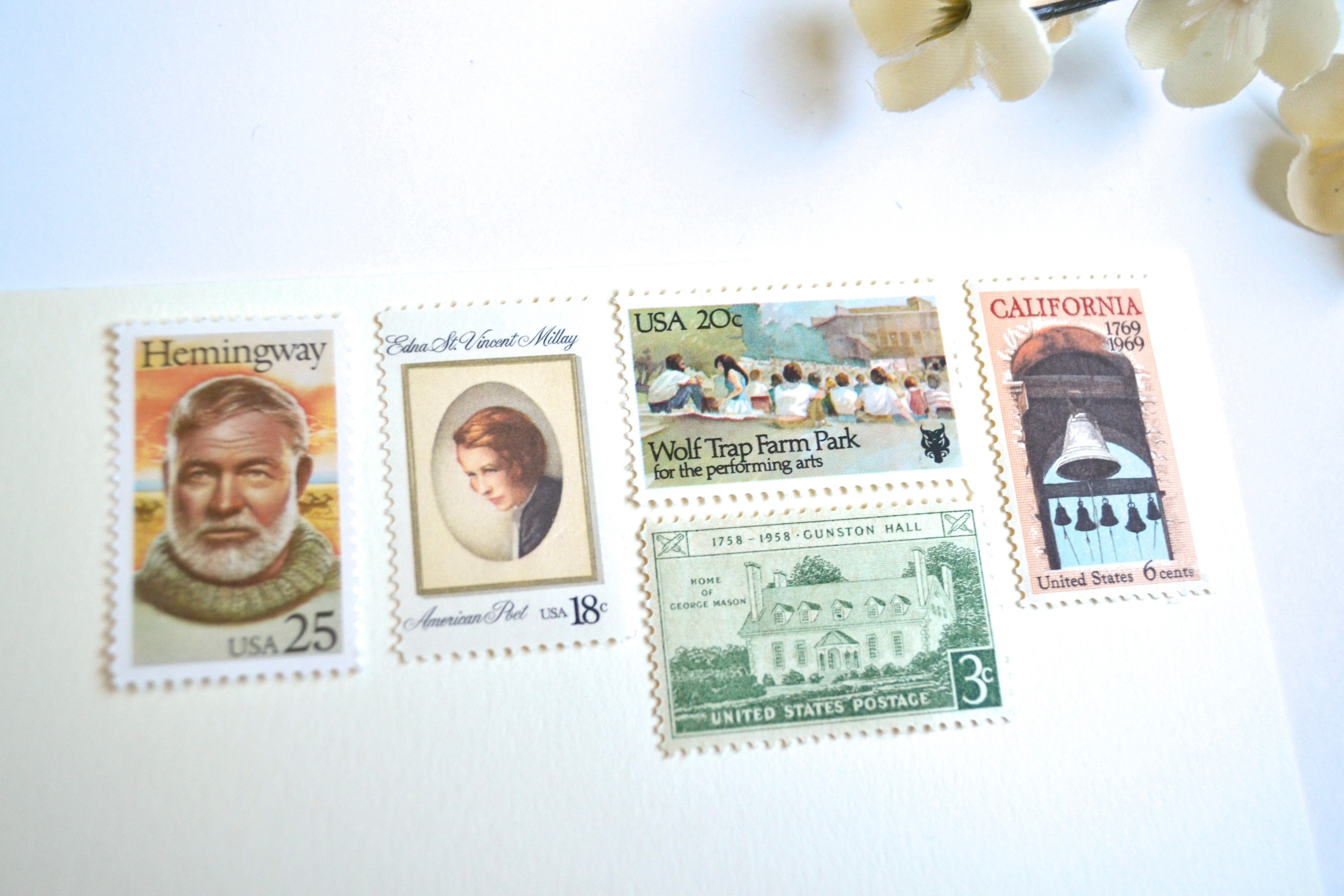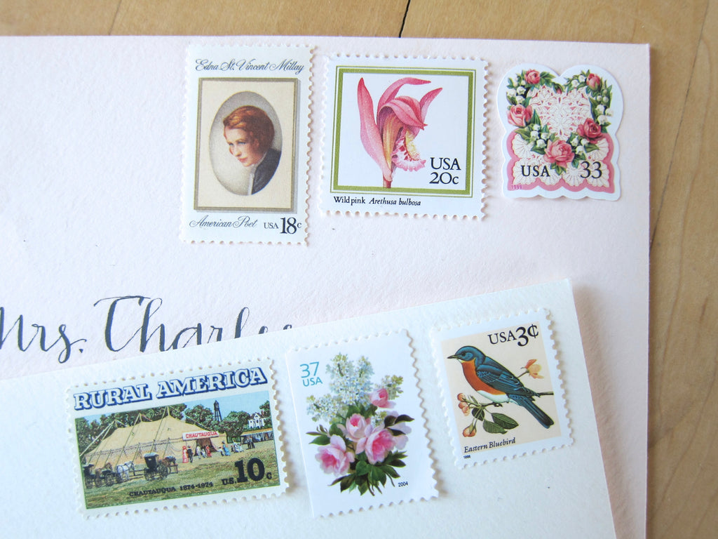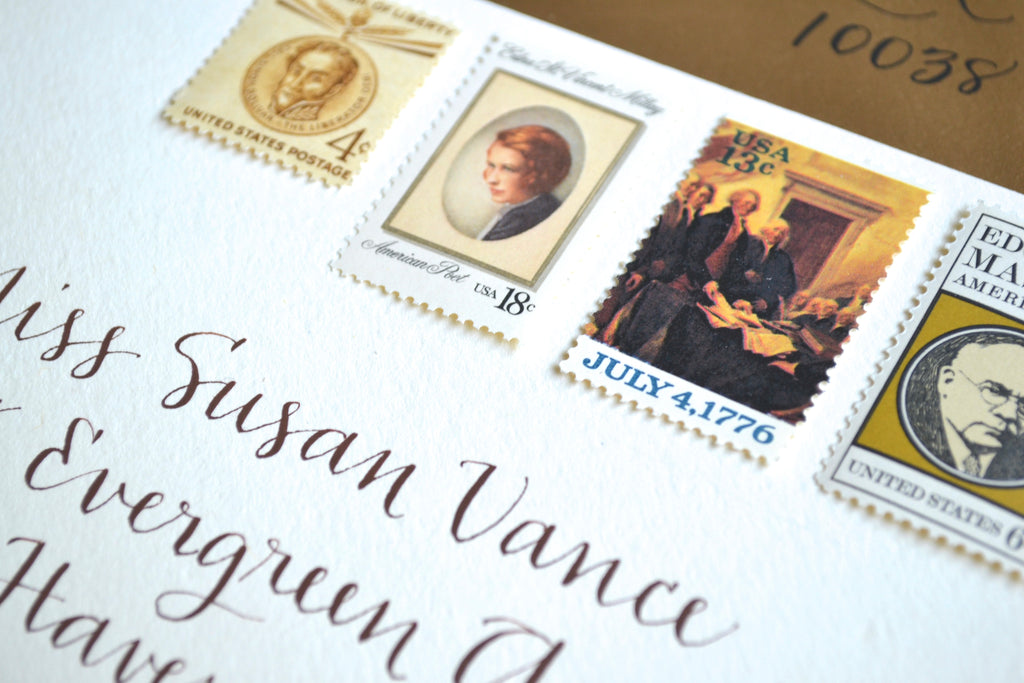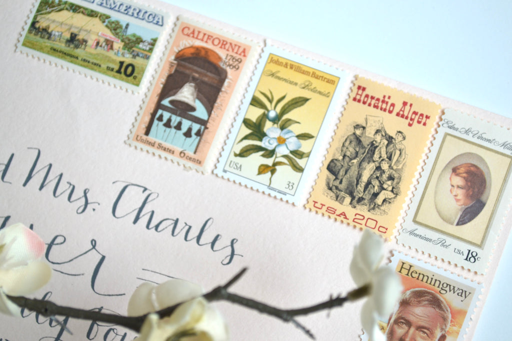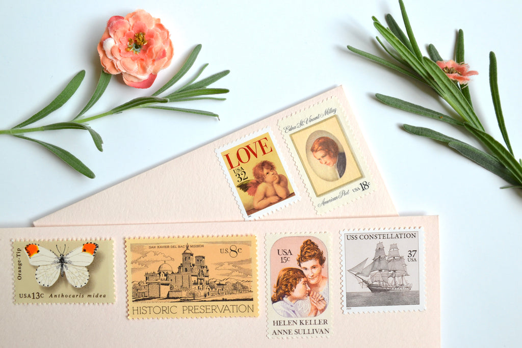 My vintage neutral stamps are perfectly suitable for use as postage for mailing, as long as you use additional stamps to add up to the current postage rate. These charming Edna St. Vincent Millay stamps will add an enchanting touch to your art deco, European destination or Old World minimalist palette wedding invitations, save the dates, or letter writing greeting cards.